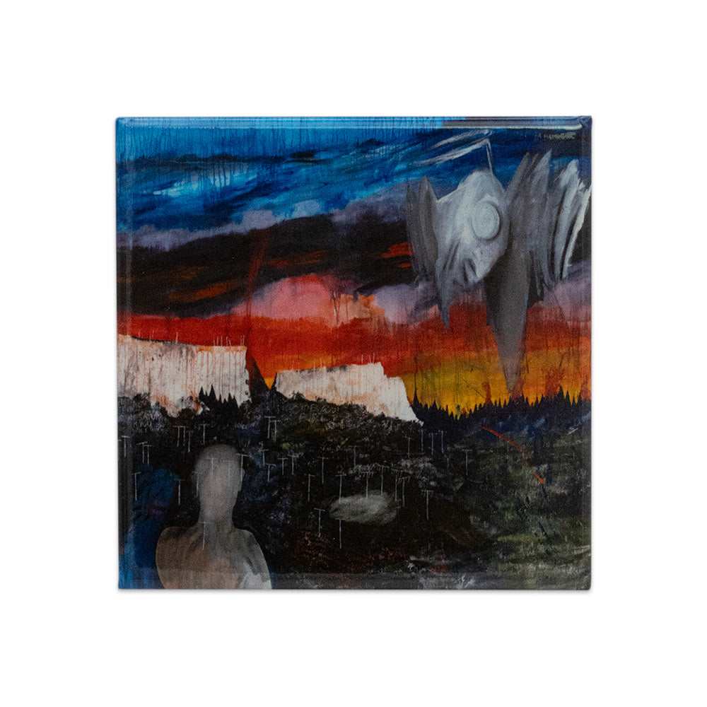 A decorative fridge magnet, depicting Stanley Donwood's ‘Get Out Before Saturday’ design